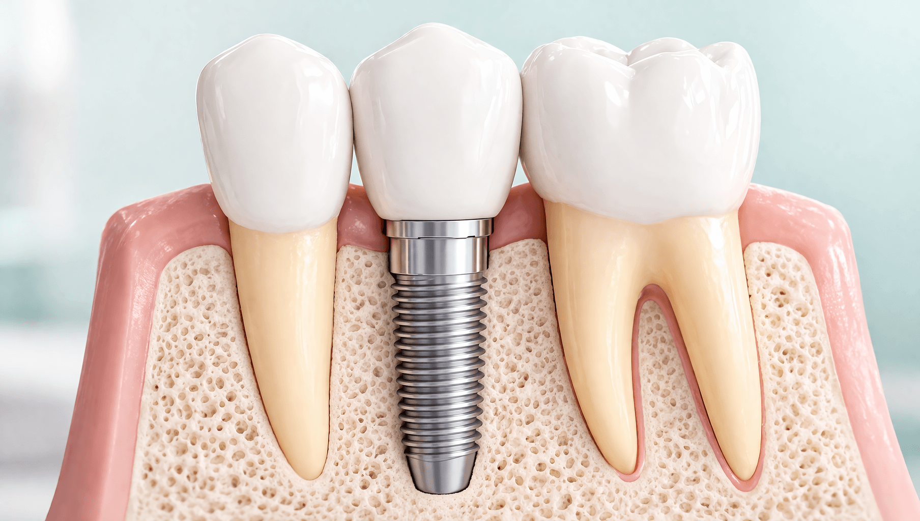 インプラントは、歯を失った部分の顎の骨に人工歯根(主に医療用チタン)を埋めて、天然歯に近い機能と見た目を回復させる治療法です。
