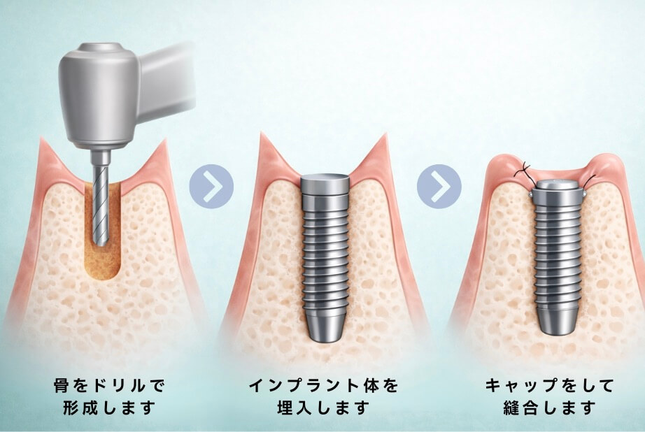埋インプラント埋入手術において歯茎の中にキャップを埋めた状態で手術を終え、インプラントと骨が結合したら歯茎の上に